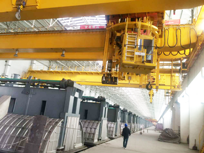 焙燒多功能天車主要有哪些用途?焙燒多功能天車主要安裝在炭素陽極焙燒車間,是作為焙燒爐生產與檢修用的多功能起重設備。它一般主要用來完成以下各項作業。 1、利用陽極夾具把鏈式輸送機上的生炭塊夾住,然后送往焙燒爐的爐坑,進行裝爐作業。2、利用吸料管從焙燒爐坑內吸取填充料,然后進行粉塵分級作業。3、利用補充吸料管進行煙道內的清掃工作以及粉塵的定期排除作業。4、利用起重電葫蘆進行焙燒爐的維護保養工作。 5、利用卸料管把料箱內的填充料添加到焙燒爐的爐坑內。6、利用陽極夾具把焙燒爐坑內的熟塊夾住,然后運往鏈式輸送機上,進行出爐作業。7、利用起重葫蘆進行燃燒器裝置的搬運作業。8、往料箱內填加新的填充料等等。以上就是焙燒多功能天車一些主要用途,總之是功能較多的一類起重設備,凱源起重專業生產優質焙燒多功能天車,性價比更高,歡迎大家咨詢。